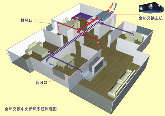 新风系统是由风机、进风口、排风口及各种管道和接头组成。安装在吊顶内的风机通过管道与一系列的排风口相连,风机启动,室内受污染的空气经排风口及风机排往室外,使室内形成负压,室外新鲜空气便经安装在窗框上方(窗框与墙体之间)的进风口进入室内,从而使室内人员可呼吸到高品质的新鲜空气。新风系统应用于全热交换器、新风机、新风交换器等产品,使其功能各有所长,得到新的发展。